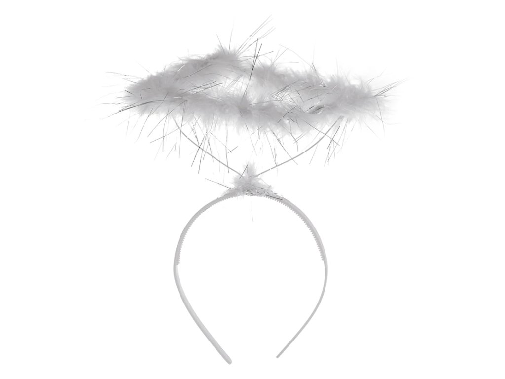 Svatozář je k plastové čelence připevněná pomocí bílých drátů. Díky nim si ji můžete natáčet a tvarovat do různých poloh. Samotná aureola je vyrobená z drátu potaženého péřovou girlandou, ve které jsou vetkané stříbrné lamely. Díky nim se nebesky třpytí.