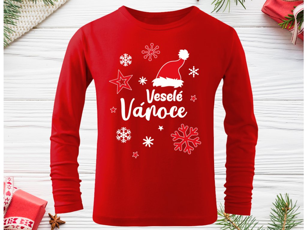 Čepička Veselé Vánoce - Dětské triko červené dl.rukáv
