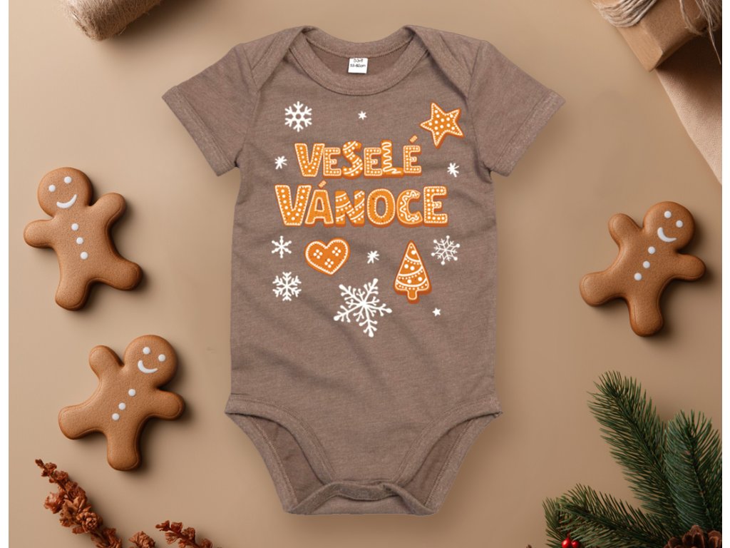 Perníčkové body s potiskem Veselé Vánoce. Limitovaná edice v biobavlně, barva mocha.