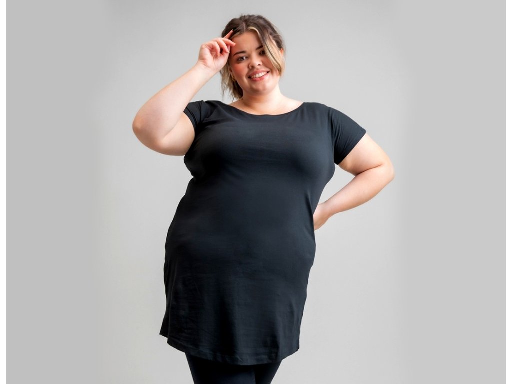 Rovný, ležérní střih, široký výstřih, motýlí rukávy bez ramenního švu, zaoblený lem .